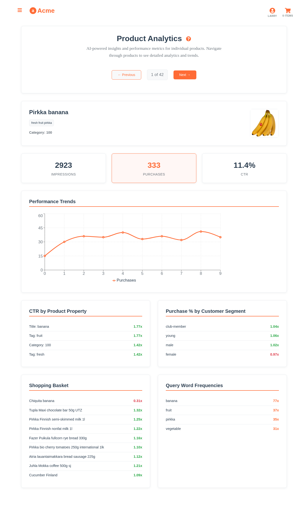 This application demonstrates how predictive database can be used in real life. All features are done with SQL-like queries with sub-50ms inference time in this demo environment (production scales 20-168ms across 10M+ records). Zero ML training or model deployment are needed, because aito.ai's realtime statistical modeling capabilities.